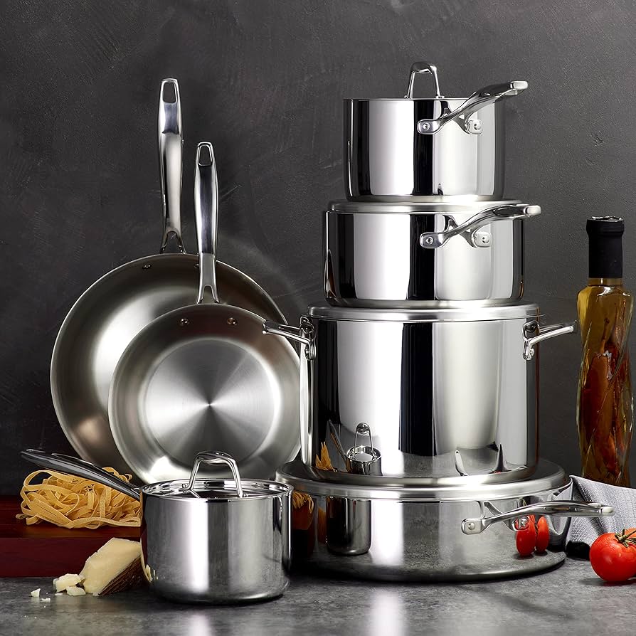 Whether you're a home or professional chef, the Tramontina Signature Tri-Ply Clad Stainless Steel Cookware Set is perfect for all your cooking needs. Featuring tri-ply construction with an aluminum core surrounded by two layers of 18/10 stainless steel. This design ensures even heat distribution, reducing hot spots and giving you more control over your cooking.