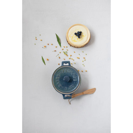 Blue Stoneware Brie Baker with Bamboo Spreader