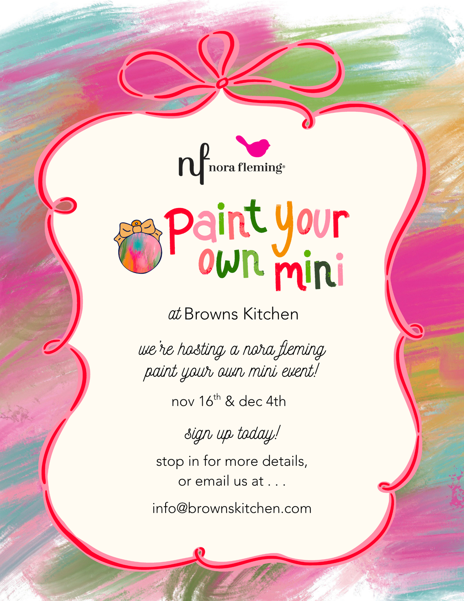 Get crafty with Nora Fleming!Join us on Sunday, November 16th from 1–2 PM or December 4th from 6-7 PM for a festive Paint Your Own Mini event. Each guest will receive a Nora Fleming dainty dish + a blank ornament mini to design and take home. We’ll have holiday tunes playing, tasty bites to enjoy, and plenty of creative fun. Spots are limited—reserve yours today!
