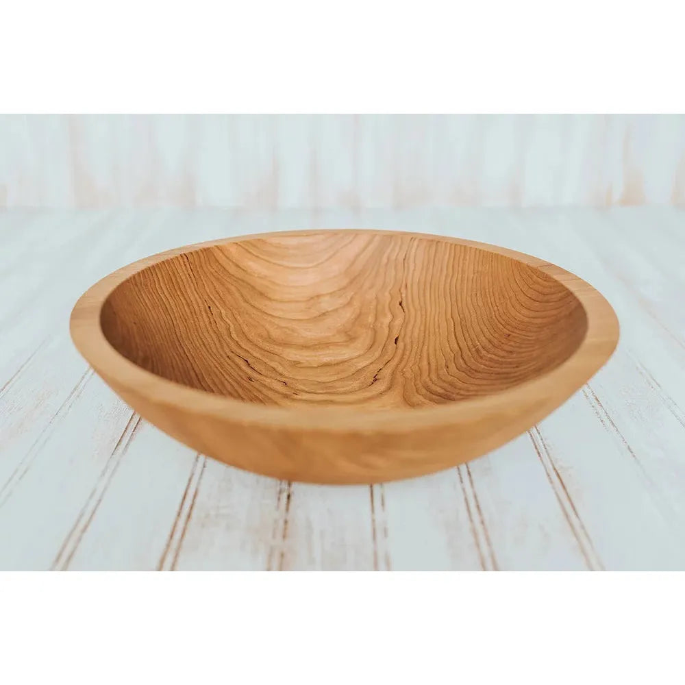 Introducing our 12 inch Cherry Bowl Bee's Oil Finish - a versatile and unique gift for any special occasion. Handcrafted by skilled artisans at the Holland Bowl Mill, this solid cherry bowl has a beautiful wood grain and is finished with food safe Bees Oil for a natural shine.