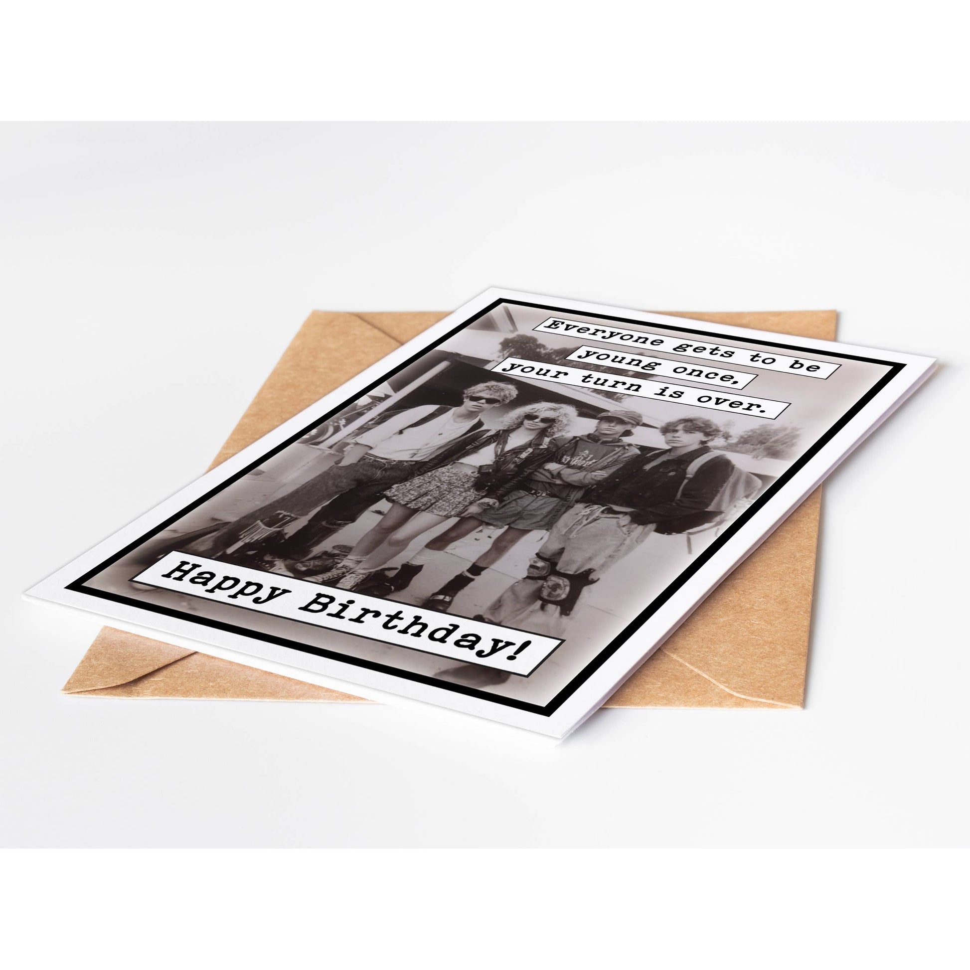 Mark the milestone with this cheeky birthday card that humorously announces the end of someone's youth. It's a playful way to acknowledge that their carefree days are officially behind them—time to embrace the next chapter with grace (or at least a good sense of humor). Perfect for anyone hitting a significant birthday who can laugh at the passage of time. This card delivers the message with a wink and a nudge, making it the ideal pick for friends who appreciate honest, funny birthday wishes.