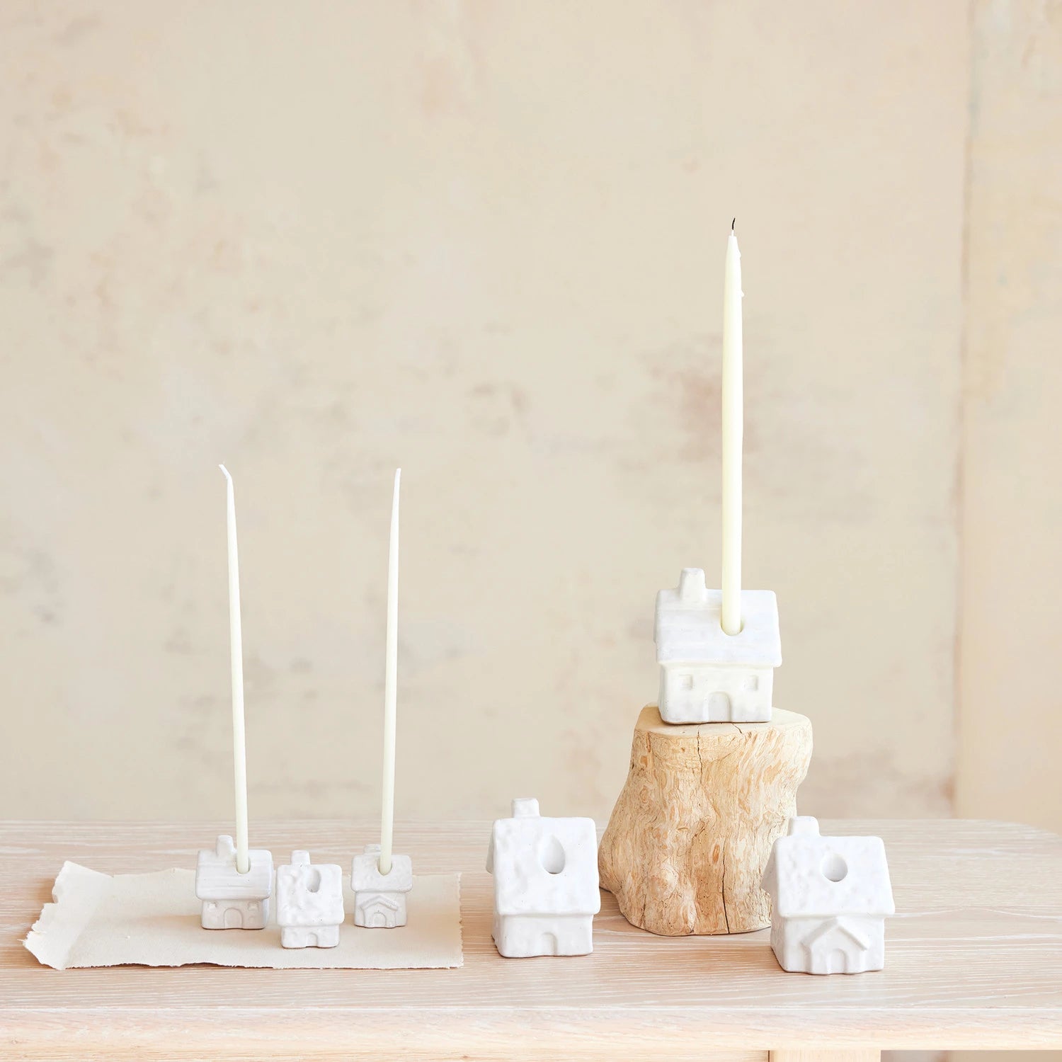 Light up your space with this charming house-shaped taper holder crafted from white stoneware. Each piece is uniquely handmade, so no two are exactly alike—adding character and individuality to your décor. Designed to securely hold standard 1/2" taper candles, it's perfect for creating ambient lighting on mantels, shelves, or dining tables. The clean white finish pairs beautifully with any style, from rustic farmhouse to modern minimalist. A delightful way to display your favorite candles while adding a touch of cozy charm to your home. Sold individually.