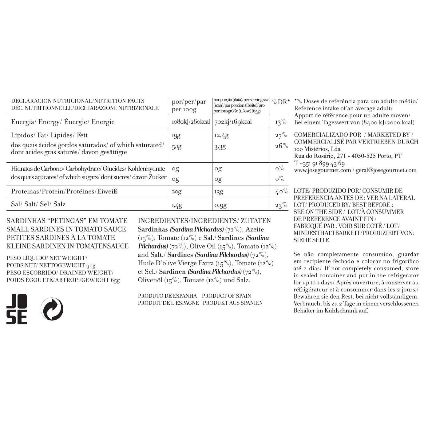 Discover the rich flavors of the sea with José Gourmet's Small Sardines in Tomato Sauce. Sourced with utmost care, these sardines (sardina pilchardus) make up 72% of the content, bathed in a luscious mix of 15% olive oil and 12% tomato, with a hint of salt to enhance the taste. This delicacy is available year-round, ensuring you can enjoy the exquisite taste whenever your palate desires. José Gourmet is committed to adding value to your dining experience, maintaining an honest relationship with suppliers and customers alike. Enjoy the quality and tradition encapsulated in each 90g tin.