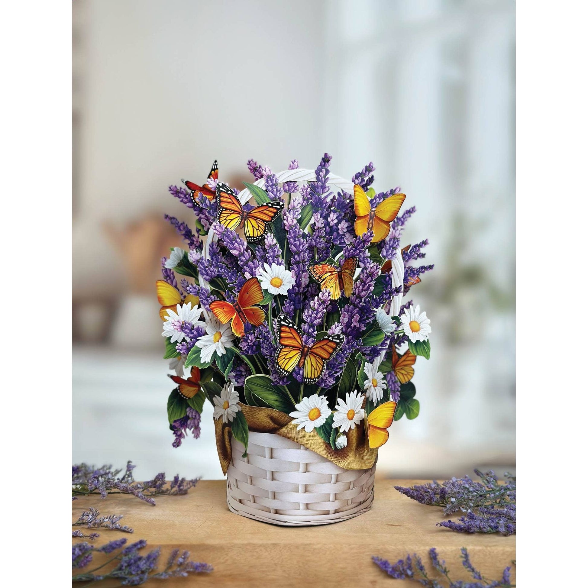 Each pop up flower card includes a small blank coordinating notecard. Inspired by the fragrant lavender fields of Provence, comes a charming basket full of monarch butterflies and delicate purple blossoms! This beautiful lavender pop-up card is a springtime favorite with textured and dreamy wildflowers. Symbolic of tranquility and peace, this nature inspired gift is perfect for her. With a simple pinch, the butterflies spring to life in 3D!