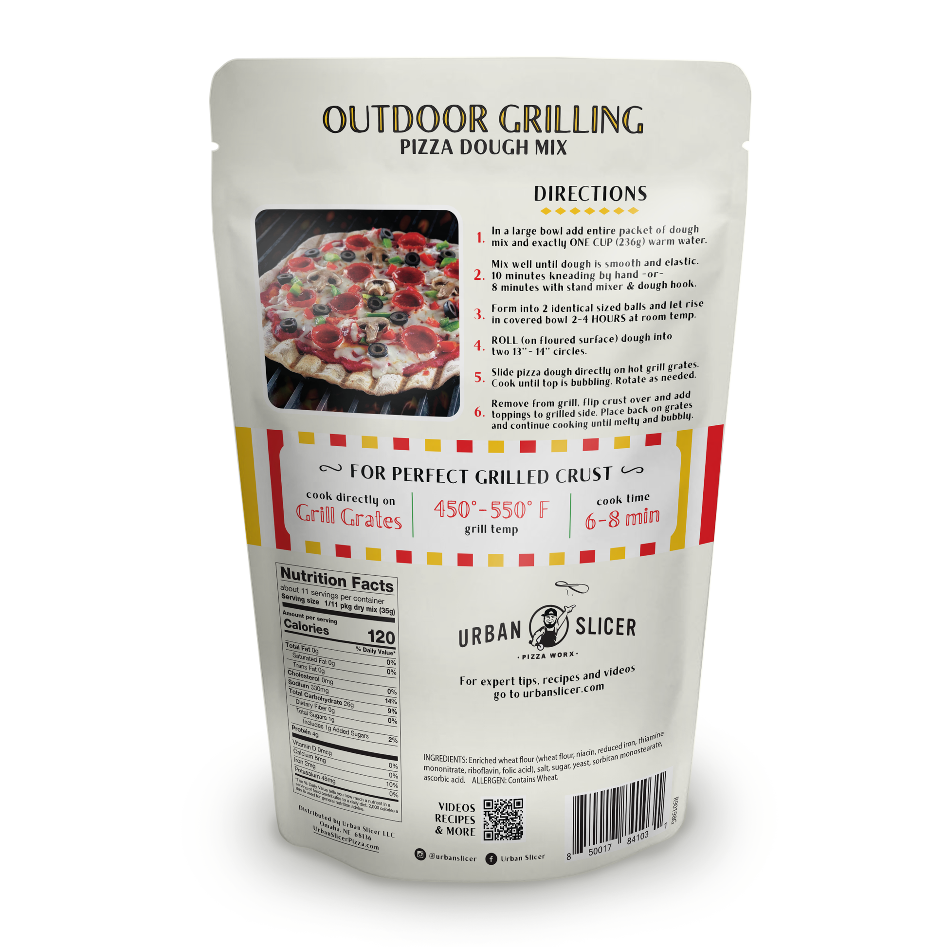 Fire up your grill because this dough is designed to cook directly on the grates. Each package makes TWO 14" Outdoor Grilling crusts. Urban Slicer's Outdoor Grilling Dough is our lowest gluten blend, which lends well to those awesome Thin 'n Crispy pizzas. It works perfectly for pizzas, calzones, pizza rolls, flour tortillas and so much more.