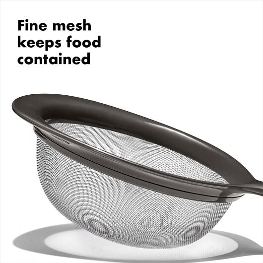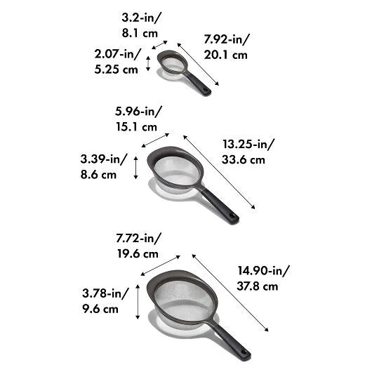 Efficiently strain, rinse, and drain with the Oxo 3 Piece Strainer Set. The set includes 3 sizes for various needs: 3-inch for citrus juice, 6-inch for berries, and 8-inch for pasta. These sturdy, dishwasher-safe strainers have comfortable grips and wide rims for stability. Easily store with their handle holes.