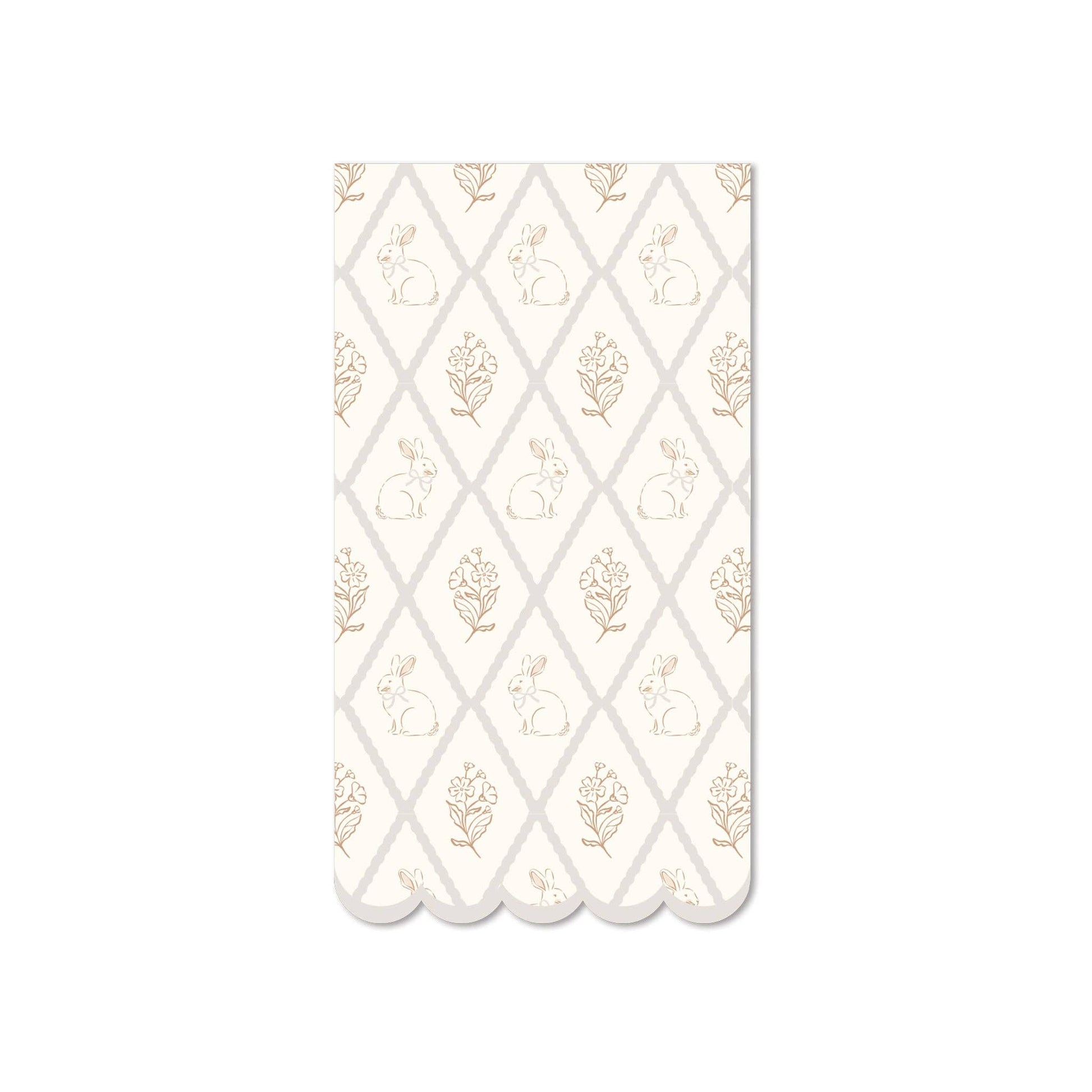 Hop into Easter celebration mode with these charming bunny pattern guest napkins! Featuring an adorable bunny design with scalloped edges, this 24-count pack brings festive flair to your spring table setting. Perfect for Easter brunches, spring gatherings, and holiday parties, these napkins add a playful touch that guests will love. • Includes 24 napkins • Folded napkins measure 4.25" x 7.75"